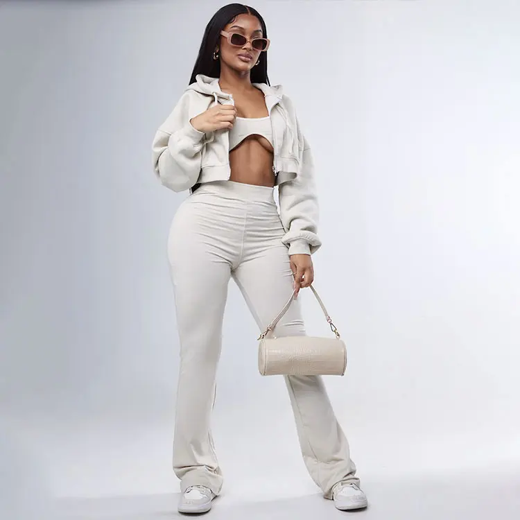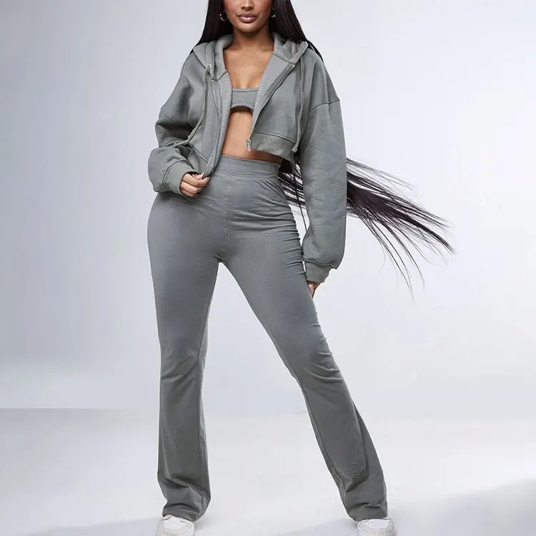 Custom Logo 100% Cotton Heavyweight Hooded Tracksuits Legging 3 Piece Set Blank Crop Top Zip up Hoodie & Flare Sweatpants Women
